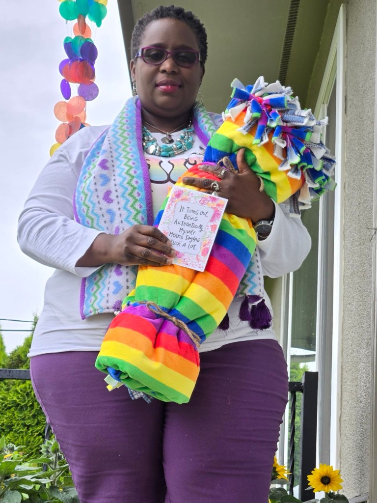 Here’s the story: As I prepared for that working retreat, I was both excited and sick to my stomach because I did not trust the people in leadership at that event, though I trusted the process. Just before I left my house for the drive there I had a strong message that I NEEDED my own Warmth And Loving Kindness rainbow blanket. I had never made myself one.