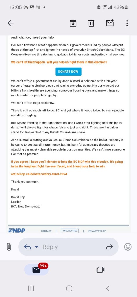 And as a foster parent who served under the NDP government for nine years, and who was penalized and fired specifically for speaking up and for helping when help was needed, as a mother whose children adopted through MCFD, have been abandoned by Mr. Eby’s NDP and left to come to harm, and neither served nor protected by the RCMP under Mr. Eby’s NDP, as an independent community worker whose initiative to inspire the community to stand with vulnerable, traumatized women and children was ignored and undermined by Mr. Eby’s NDP, and as a person who now has a disability and who continues to valiantly fight to stand when left to flounder by Mr. Eby’s NDP, I ask, if with my vote I give you the opportunity to lead, what good will it do for those of us who are consistently systemically disenfranchised, much like those on whose backs, in your email, you wish to stand to encourage us to choose you as leader of ALL the people of British Columbia?